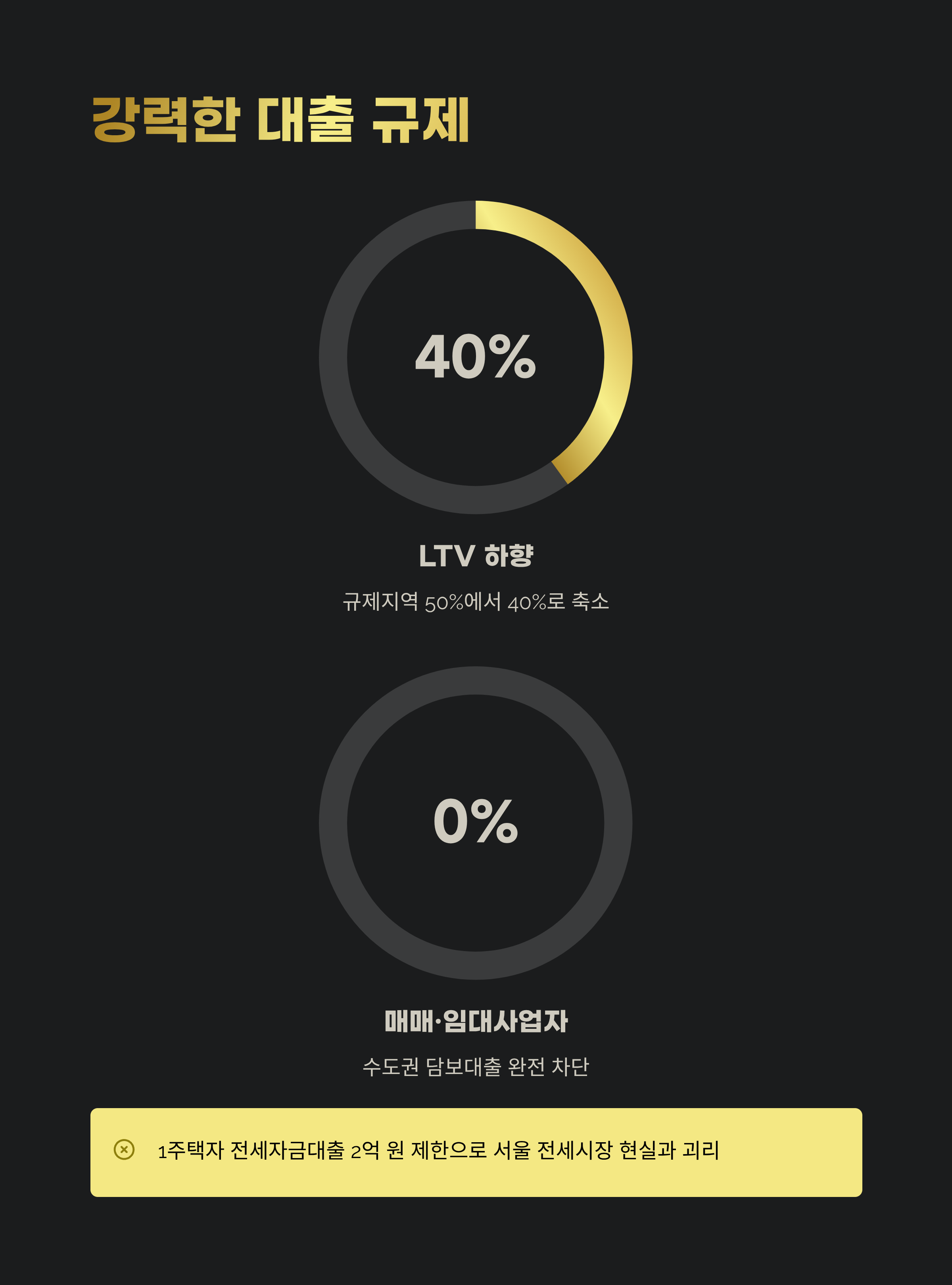 수요 억제는 이번 대책의 또 다른 핵심입니다. 규제지역 내 LTV는 50% → 40%로 하향, **수도권 및 규제지역 내 주택을 담보로 한 매매·임대사업자 대출은 아예 불가(LTV = 0%)**로 조정됐습니다.