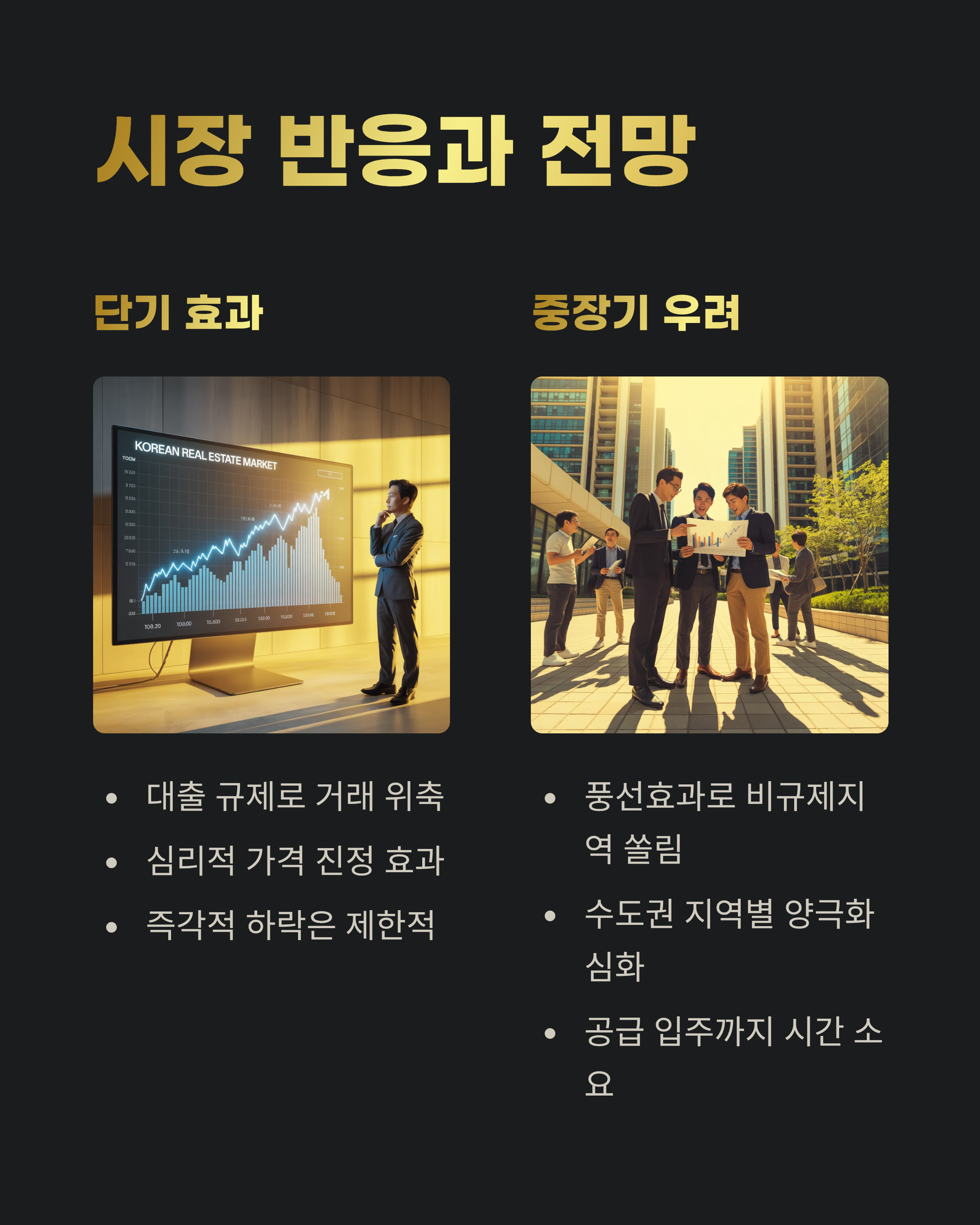 단기적으로는 대출 규제 강화로 거래 위축과 가격 진정 효과가 기대되지만, 공급이 입주로 이어지기까지는 시간이 필요하므로 즉각적인 가격 하락은 어려울 것이라는 분석도 많습니다.