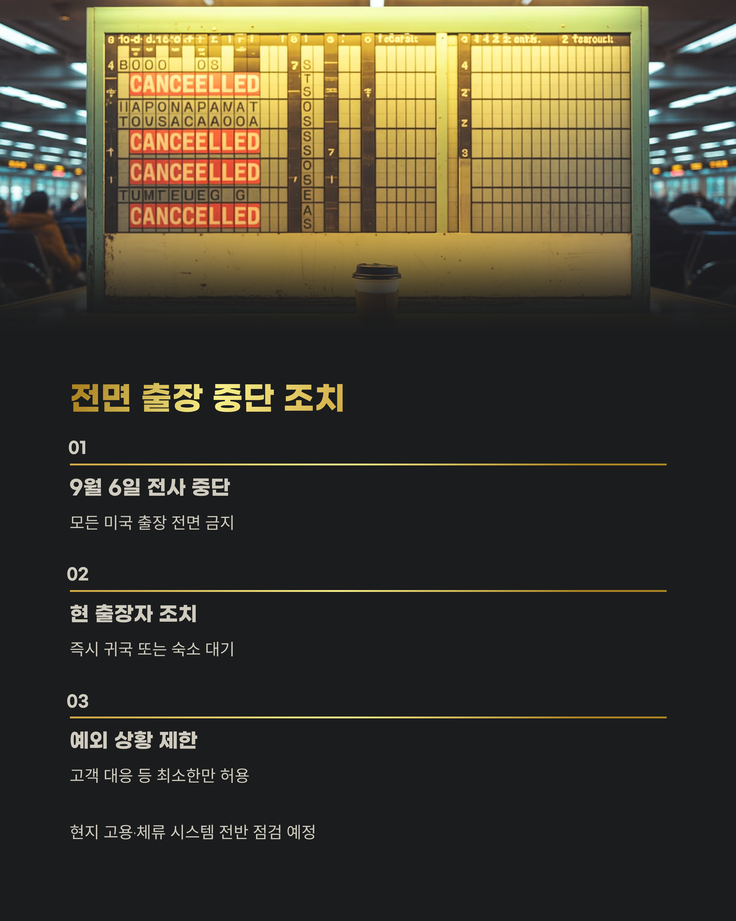 이미 미국에 나가 있는 출장자들은 업무에 따라 즉시 귀국하거나 숙소 대기 조치를 받았으며, 고객 대응 등 일부 예외 상황만 제한적으로 허용됩니다.